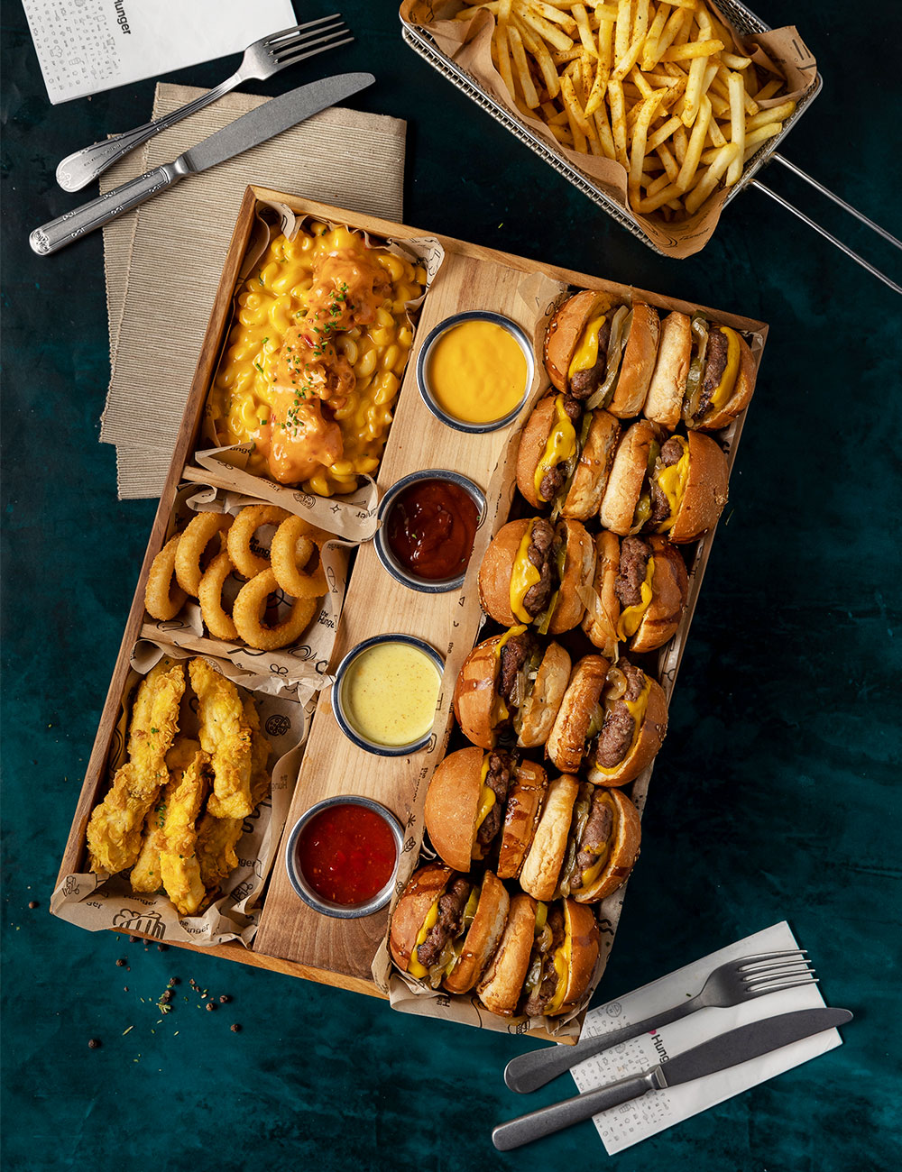 12 mini çizburger, mak&çiz+toyuq popkorn, toyuq naggets, soğan halqaları, ədviyyatlı kartof qızartması, svit çili-çeddar ədviyyatlı barbekü-bal xardal sousu
