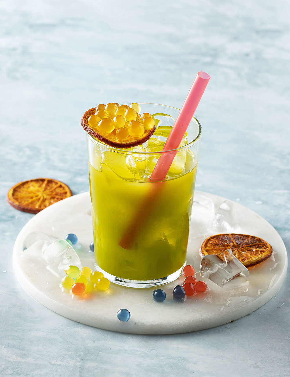 Yaşıl jasmin çayı, manqo püresi, yaşıl alma siropu, reyhan və bobajoy manqo