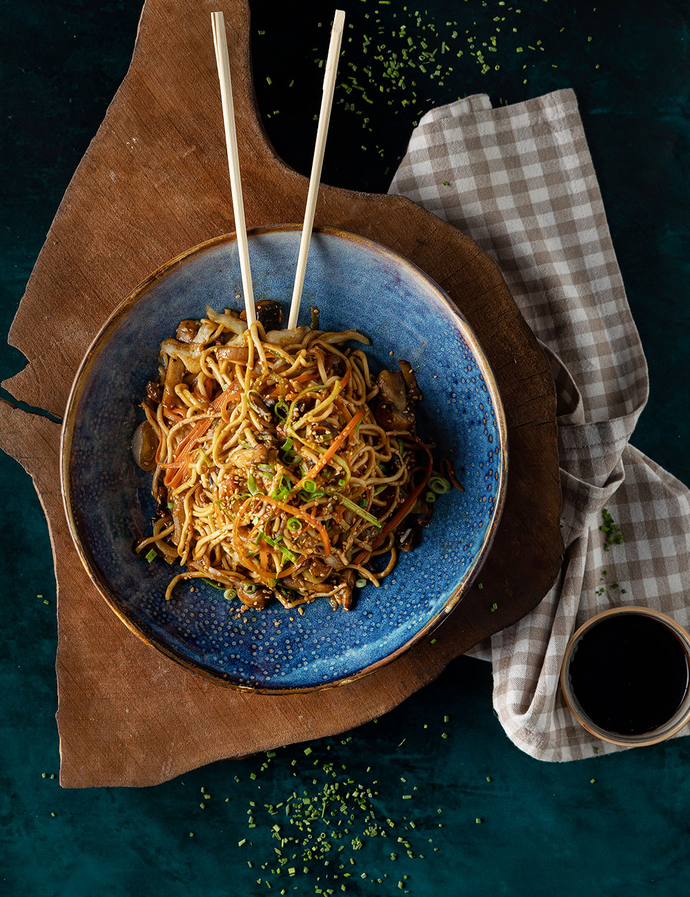 Qızardılmış qabaq, kök, göbələk, soğan, ağ kələm, qovrulmuş küncüt, nudl sousu