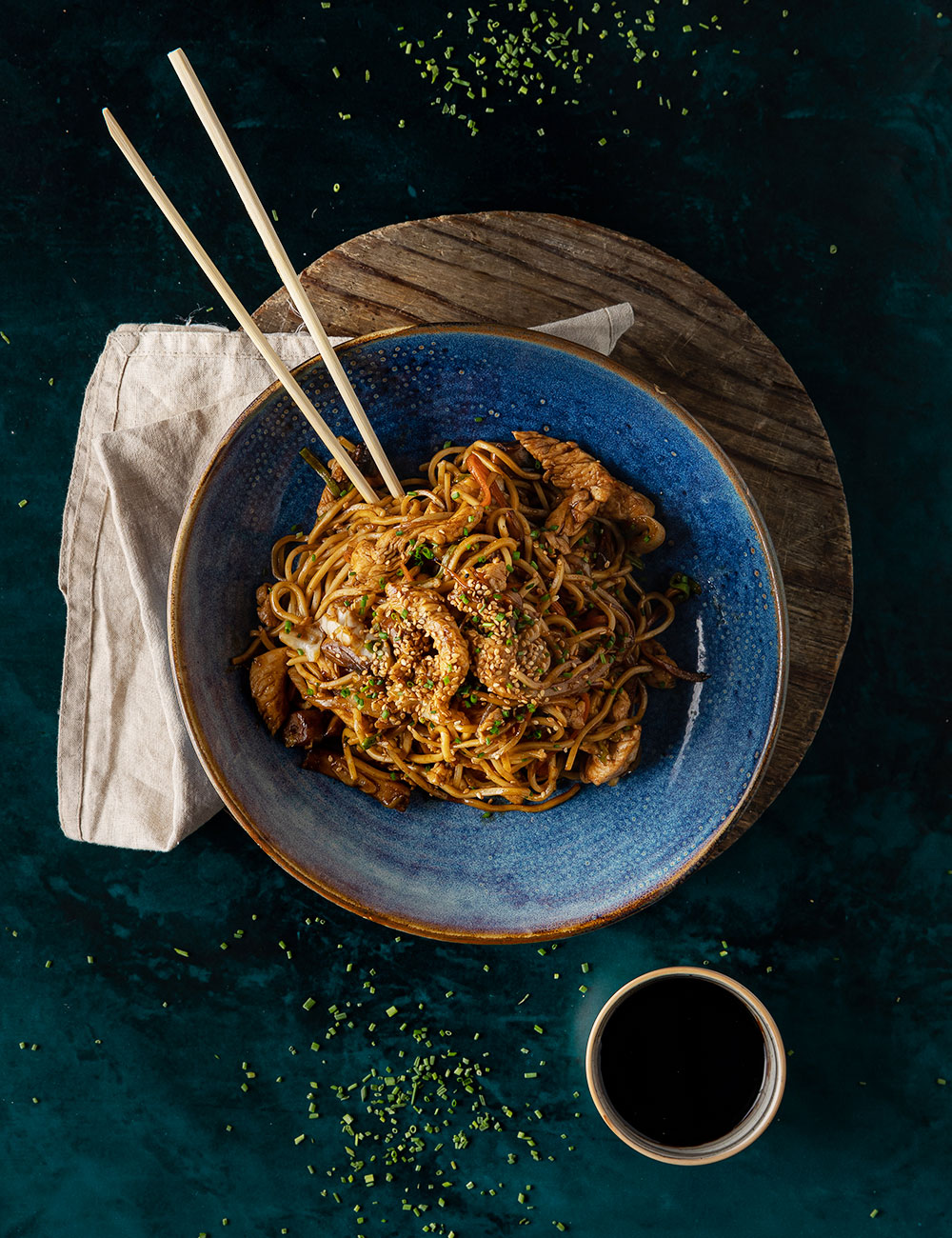 Qızardılmış qabaq, yerkökü, soğan, ağ kələm, rəngli bibər, küncüt, yaşıl soğan, oyster sous, soya sousu, küncüt yağı